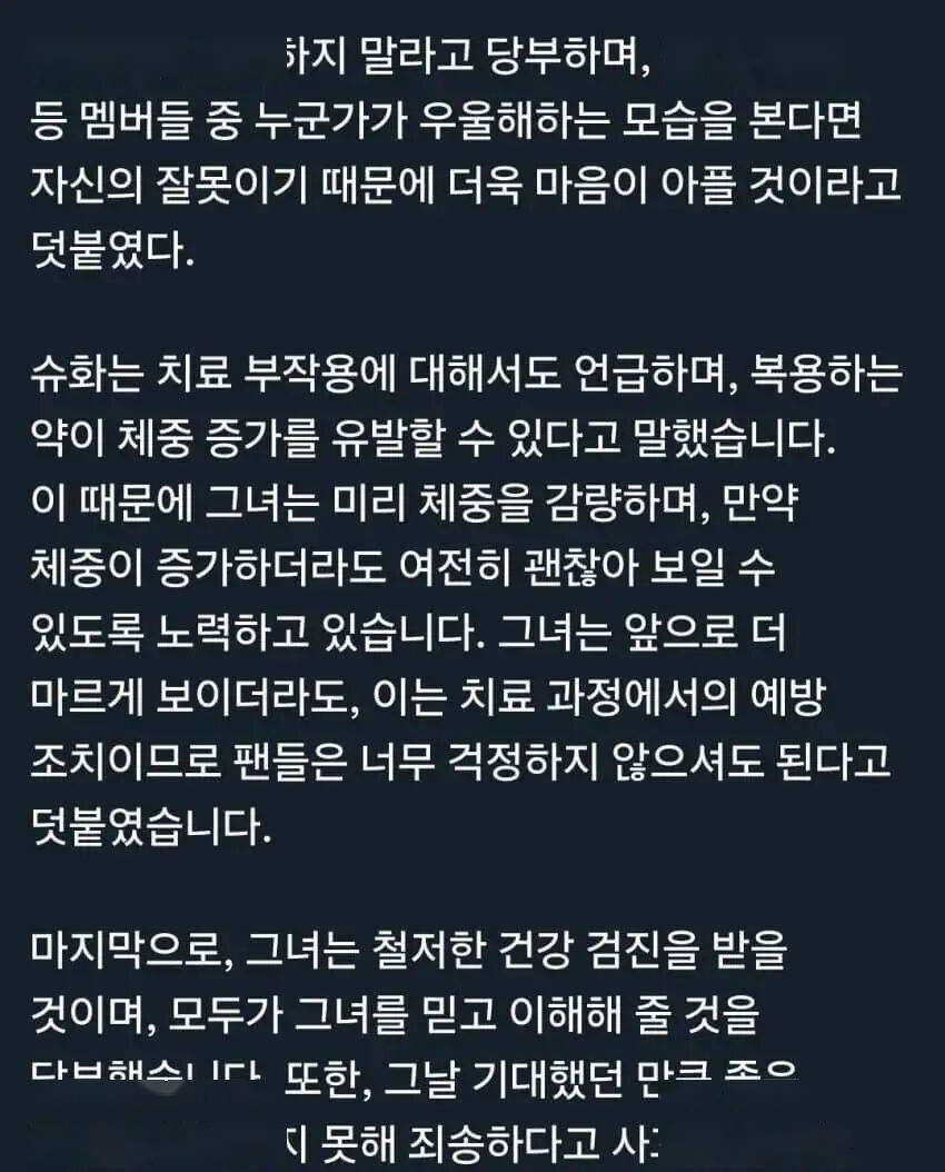 最戳心的是,舒华还特别为队友们着想。她恳请粉丝,如果看到成员Minnie或雨琦因她的状况而神情低落,“请不要伤心”,否则会让她“更加心碎”,觉得“全是自己的错”。这份在病痛中仍顾及他人感受的细腻,让不少网友直呼“太懂事”。